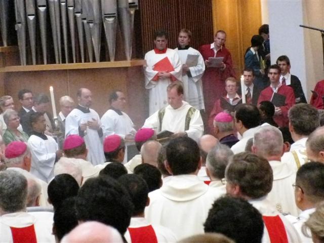 Deacon Paul OP chants the gospel at the lecturn at the entrance end of the Cathedral