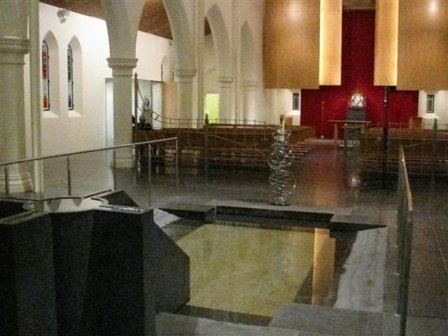 A view of the interior of Old St Patrick’s which is now the Narthex with the Baptismal Font and Pool (with Paschal Candle stand reminiscent of the Amnesty International Candle) and the Blessed Sacrament Chapel